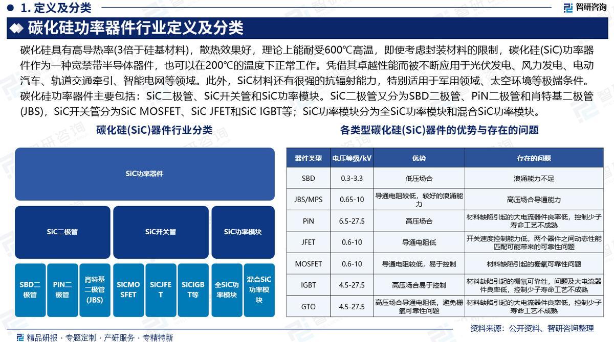 行业定义及分类:碳化硅具有高导热率(3倍于硅基材料),散热效果好,是领先的第三代半导体材料。因备卓越性能,成为功率器件行业未来发展的关键材料。碳化硅功率器件主要包括:SiC二极管、SiC开关管和SiC功率模块。SiC二极管又分为SBD二极管、PiN二极管和肖特基二极管(JBS),SiC开关管分为SiCMOSFET、SiCJFET和SiCIGBT等;SiC功率模块分为全SiC功率模块和混合SiC功率模块。