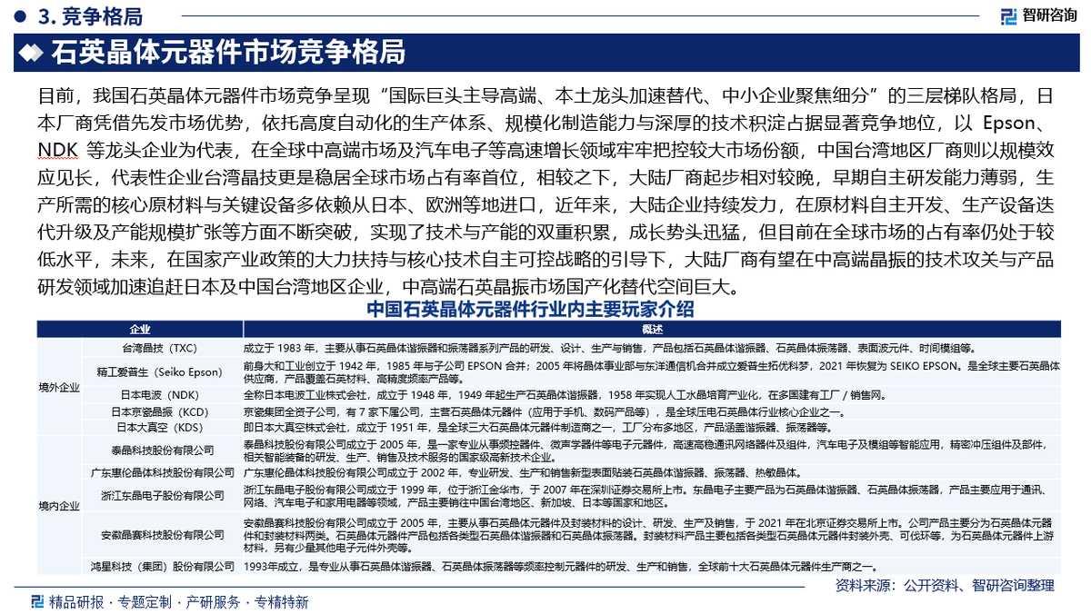 市场竞争格局:目前,我国石英晶体元器件市场竞争呈现“国际巨头主导高端、本土龙头加速替代、中小企业聚焦细分”的三层梯队格局,日本厂商凭借先发市场优势,依托高度自动化的生产体系、规模化制造能力与深厚的技术积淀占据显著竞争地位,以 Epson、NDK 等龙头企业为代表,在全球中高端市场及汽车电子等高速增长领域牢牢把控较大市场份额,中国台湾地区厂商则以规模效应见长,代表性企业台湾晶技更是稳居全球市场占有率首位,相较之下,大陆厂商起步相对较晚,早期自主研发能力薄弱,生产所需的核心原材料与关键设备多依赖从日本、欧洲等地进口,近年来,大陆企业持续发力,在原材料自主开发、生产设备迭代升级及产能规模扩张等方面不断突破,实现了技术与产能的双重积累,成长势头迅猛,但目前在全球市场的占有率仍处于较低水平,未来,在国家产业政策的大力扶持与核心技术自主可控战略的引导下,大陆厂商有望在中高端晶振的技术攻关与产品研发领域加速追赶日本及中国台湾地区企业,中高端石英晶振市场国产化替代空间巨大。