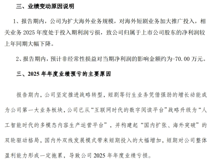 中文在线称:为扩大海外业务规模,对海外短剧业务加大推广投入,相关业务2025年度处于投入期利润亏损;