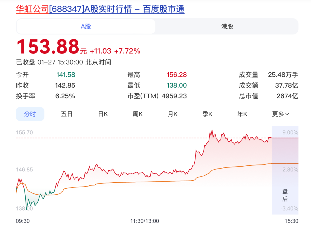 1月27日午后,半导体晶圆代工龙头华虹公司(688347)涨超8%,再创历史新高,总市值突破2000亿元。