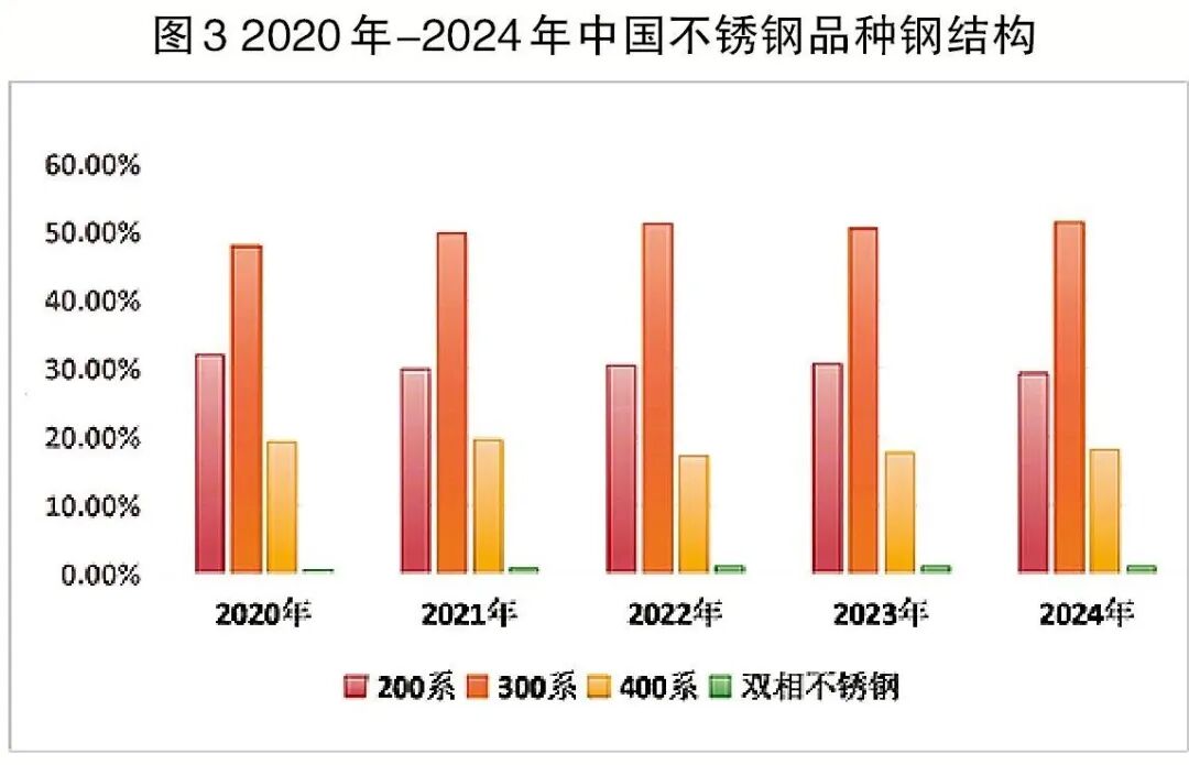“十四五”期间,中国不锈钢品种结构调整明显加速。300系不锈钢比例从2020年的47.99%增至2024年51.45%,200系不锈钢比例从32.11%下降至29.32%,双相不锈钢比例从0.62%增至1.04%。含钼不锈钢的产量从2020年的117.94万吨增加至2024年的220.44万吨,比例从3.8%增至5.59%,预计2025年含钼不锈钢产量将增至250万吨。