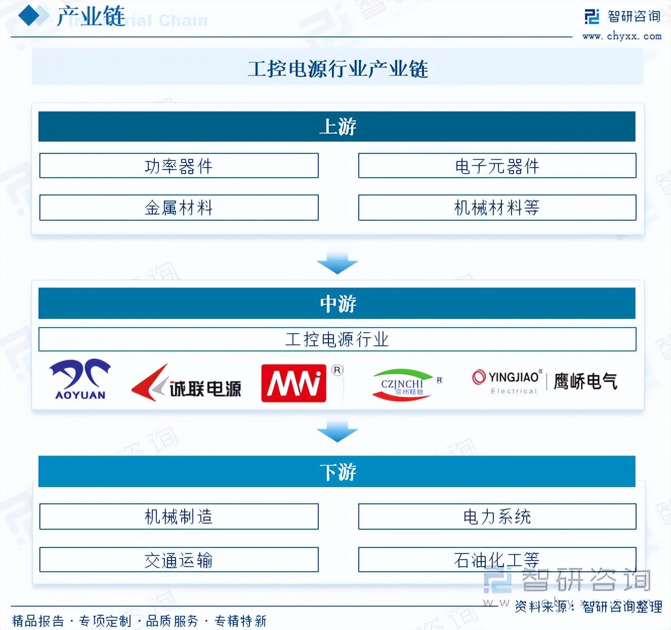 从产业链来看,工控电源行业上游原材料主要包括功率器件、电子元器件、金属材料、机械材料等,这些原材料的质量与供应稳定性,直接影响到中游产品的性能与成本。中游是指工控电源行业。下游是指应用领域,如机械制造、电力系统、交通运输、石油化工等。在这些领域中,工控电源为各种控制设备、传感器和执行器提供稳定的电力支持,确保整个工业系统的可靠运行。
