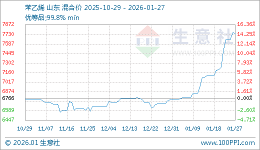 据生意社监测,苯乙烯01月27日最新价格7748.00元/吨,最近5天上涨3.72%,10天上涨8.79%,15天上涨11.26%,20天上涨14.08%,30天上涨15.85%。