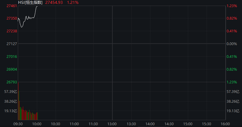 恒指涨幅扩大至1.2%,创2021年以来新高。