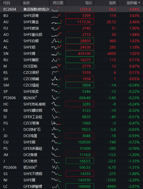 商品:国内商品期货涨跌不一,截至发稿,集运指数涨近5%,沥青、沪金涨超2%,燃油、氧化铝、沪银、沪铝、沪锡涨超1%,橡胶、豆粕、菜籽、烧碱等小幅上涨。锰硅、纸浆、铂金、热轧卷板、螺纹钢、工业硅、玻璃、铁矿石、鸡蛋、沪铜、多晶硅等下跌,焦煤、焦炭、钯金、不锈钢等跌超1%,碳酸锂、沪镍跌超2%。