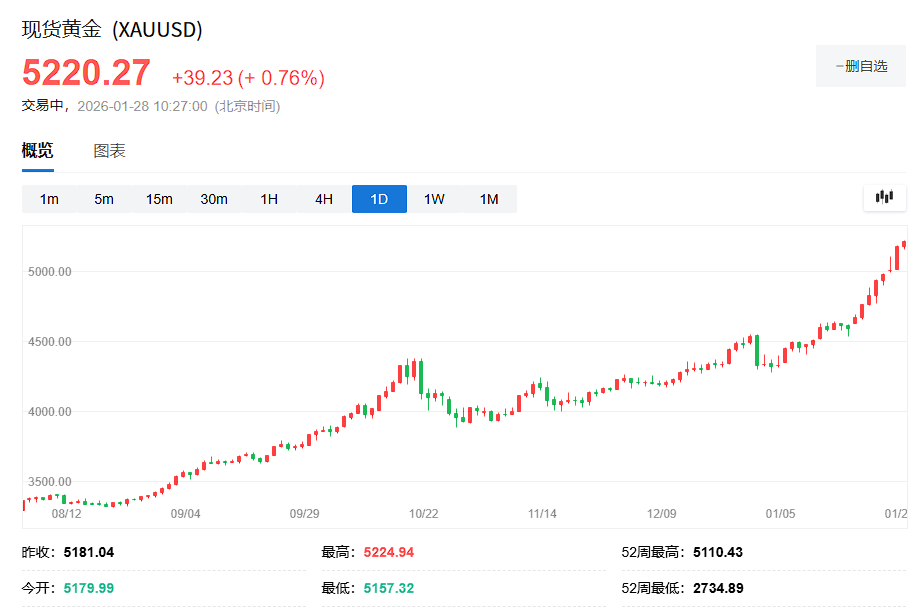 消息面,在地缘政治紧张局势持续,特朗普关税政策不确定性加剧等推动资金涌入黄金避险之际,美元指数的持续走低,给黄金带来进一步的支撑。国际黄金强势突破5200美元大关。