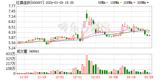 证券时报·数据宝统计显示,红旗连锁今日收盘价为6.00元,上涨0.33%,日换手率为3.05%,成交额为2.10亿元,全天主力资金净流出1401.49万元,近5日该股累计下跌5.36%,近5日资金合计净流出4916.59万元。