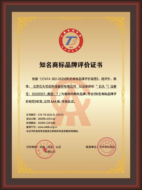 近日,北京石头世纪科技股份有限公司(以下简称“石头科技”)核心商标“石头”经过多轮严格评审,荣获 AAA 知名商标品牌评价证书。该商标注册于第 7 类“电动清洁机械和设备;真空吸尘器”等商品与服务,是企业品牌资产的重要组成部分。此次获评不仅是权威机构对“石头”商标市场声誉与综合实力的肯定,也是石头科技系统性品牌建设成果的集中体现。