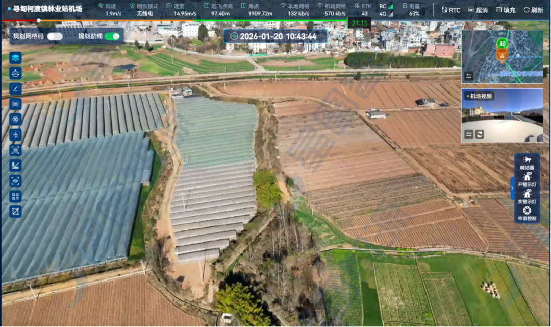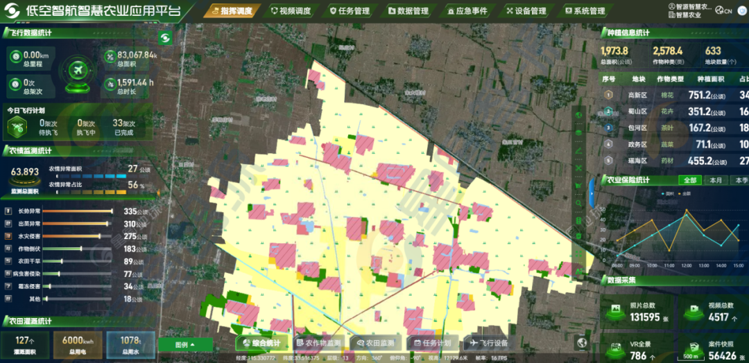 基于区域空域管理以及农业监测特性,实现低空农业任务制定智能化、监测巡检自动化,改变传统农业巡检模式,构建区域常态化农业数据成果,为农业现状以及趋势分析提供长效数据保障。