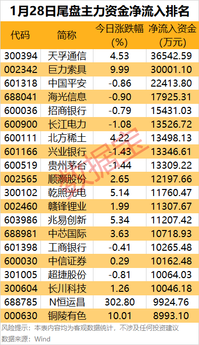 从个股来看,18股尾盘主力资金净流入金额均超1亿元,其中3股尾盘主力资金净流入均超2亿元。光模块龙头天孚通信尾盘主力资金净流入3.65亿元,居首。