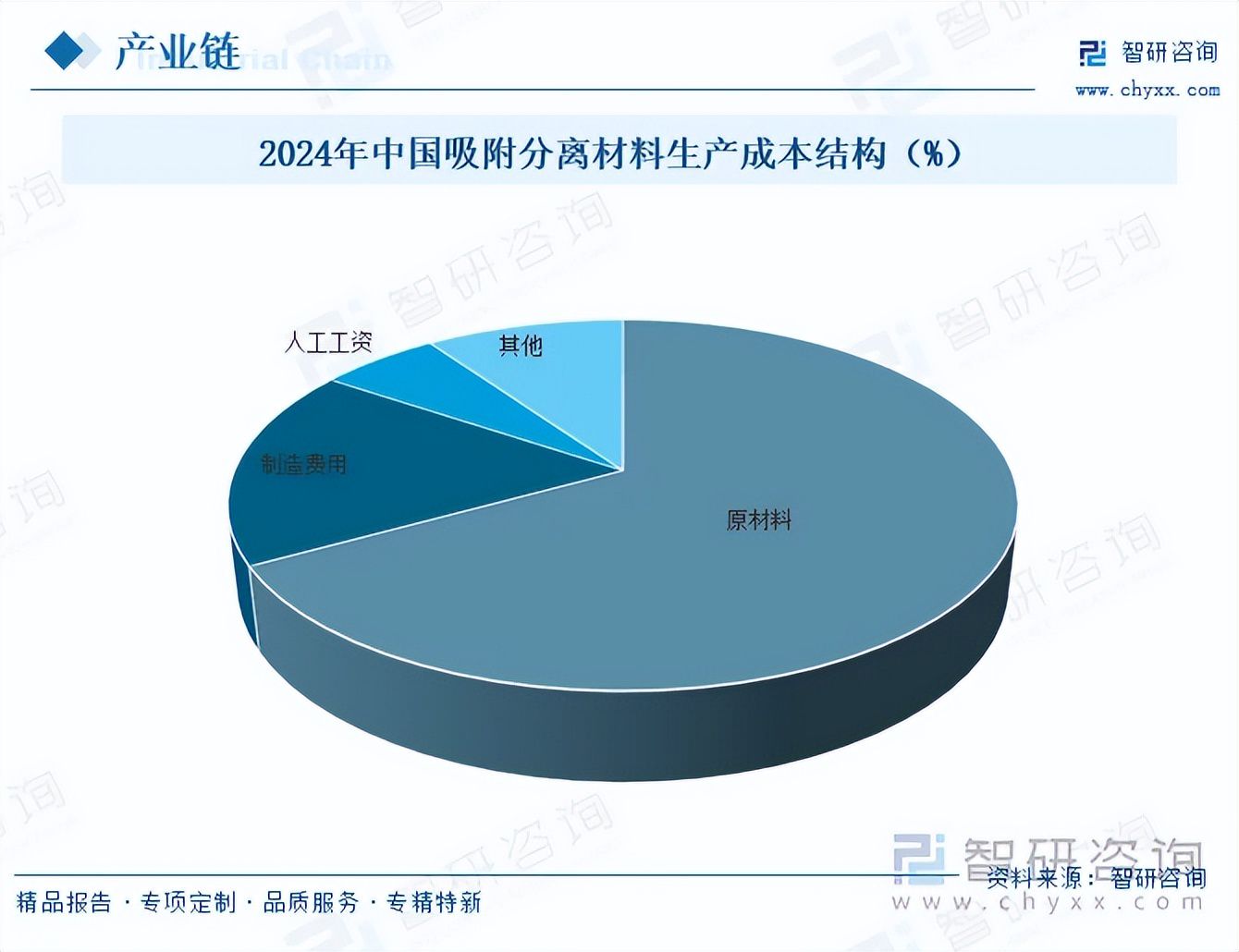 从吸附分离材料生产成本结构来看,目前,原材料占比最大,超60%,因此,吸附分离材料生产企业需要与上游行业建立深度绑定的合作关系,以此筑牢成本控制与供应链稳定的核心根基,一方面与核心原材料供应商签订长期战略供货协议,通过锁定采购量、约定价格浮动区间等方式,规避大宗商品价格波动带来的风险,保障原材料的稳定供应;另一方面可深度参与上游研发与产能规划,结合自身生产需求向供应商提出原材料性能优化建议,甚至联合开展新型原材料的研发攻关,既提升原材料与自身生产工艺的适配度,又能抢占技术先发优势。同时,部分龙头企业还可通过参股、共建生产基地等模式,进一步强化与上游的协同联动,实现从原材料研发、生产到下游加工的全链条资源整合,在控制成本的同时,构建差异化竞争壁垒,为企业持续稳健发展提供支撑。
