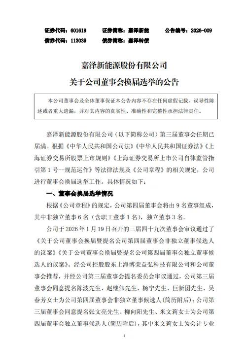 1月19日,嘉泽新能(601619)发布关于公司董事会换届选举的公告。