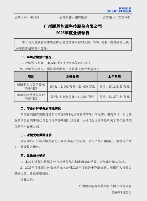 1月21日,鹏辉能源(300438)发布2025年度业绩预告。预计2025年度归属于上市公司股东的净利润1.7亿-2.3亿元,上年同期亏损25,245.57万元;预计2025年度扣除非经常性损益后的净利润8,000万元–11,000万元,上年同期亏损32,237.54万元。