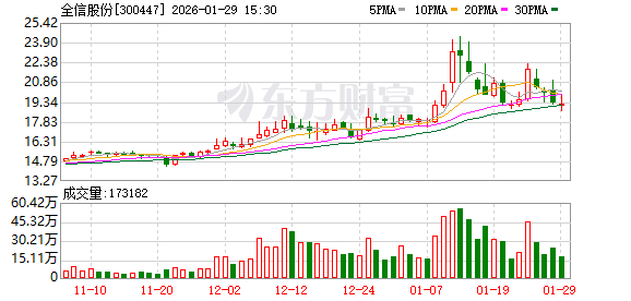 证券时报·数据宝统计显示,全信股份今日收于19.17元,下跌0.62%,日换手率为8.60%,成交额为3.33亿元,近5日下跌1.89%。通过对2025年业绩预增50%以上的个股走势进行统计发现,预告发布后当日股价上涨的占比54.24%,股价发布当日股价涨停的有19家。预告发布后5日股价上涨的占比49.44%。