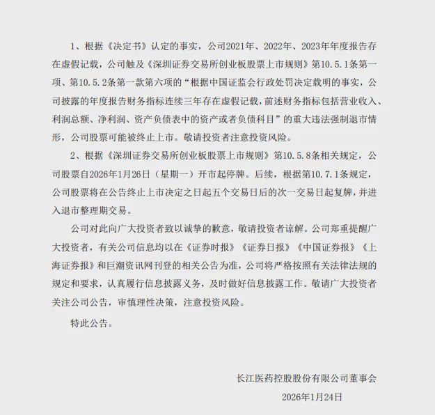 *ST长药(300391)公告称,公司于2026年1月23日收到深圳证券交易所下发的《事先告知书》,拟决定终止公司股票上市交易。