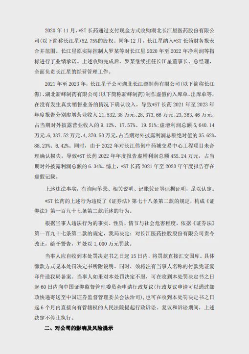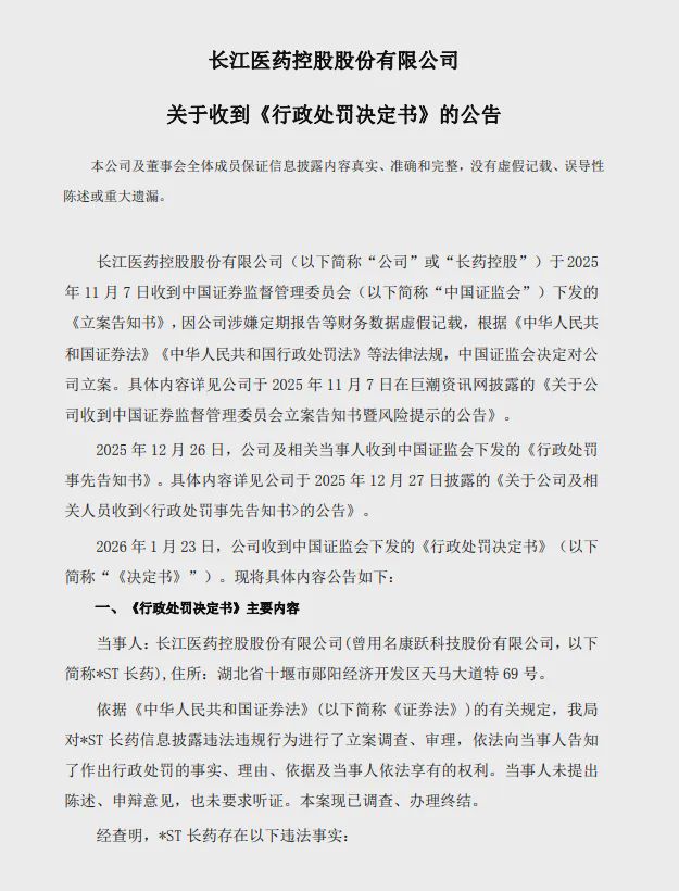 2026年1月23日,你公司收到中国证券监督管理委员会作出的《行政处罚决定书》。根据该《行政处罚决定书》载明的事实,你公司2021年至2023年年度报告信息披露存在虚假记载。