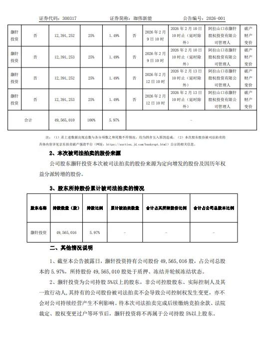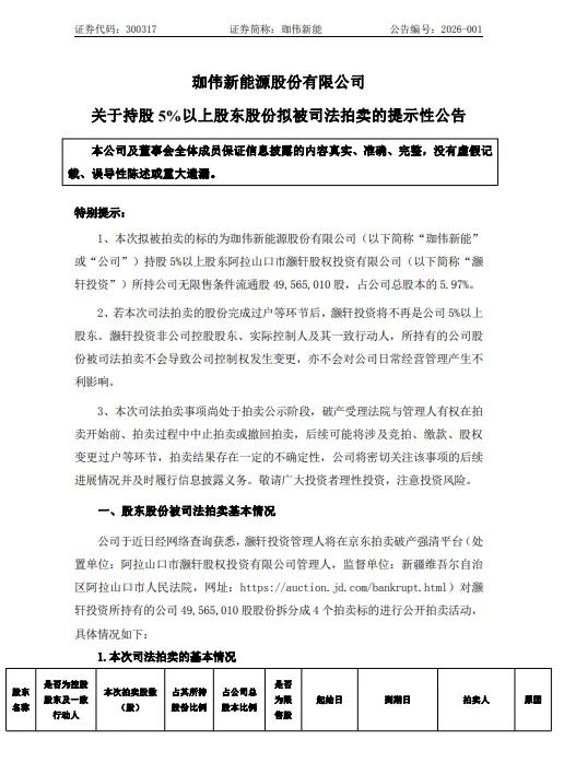 1月23日,珈伟新能(300317)公告称,公司于近日经网络查询获悉,灏轩投资管理人将在京东拍卖破产强清平台(处置单位:阿拉山口市灏轩股权投资有限公司管理人,监督单位:新疆维吾尔自治区阿拉山口市人民法院)对灏轩投资所持有的公司49,565,010股股份拆分成4个拍卖标的进行公开拍卖活动。