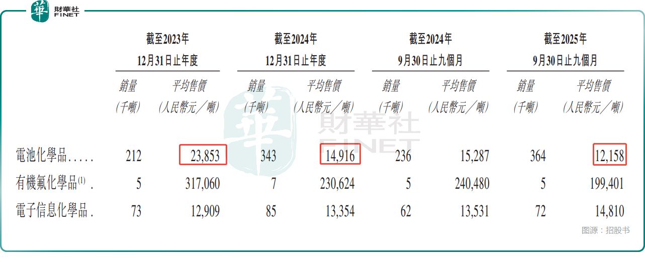 而电池化学品的毛利率下滑在很大程度上也和平均售价持续下降有关,从2023年的2.385万元/吨,已经降到了2025年前三季度的1.216万元/吨,降幅巨大,而销量则是在持续增长。
