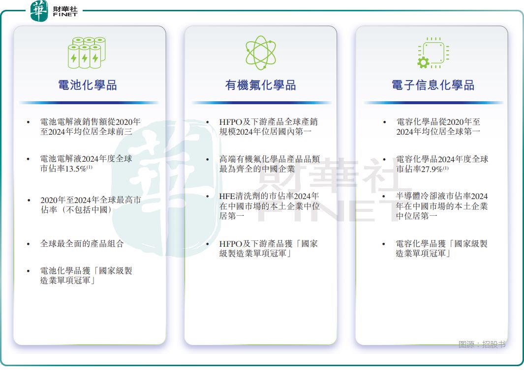 招股书披露,新宙邦在三大领域均有不俗的行业地位,如下图所示。例如,在电池化学品领域,公司是全球唯一同时具备溶质、溶剂和添加剂自供能力的规模化电解液制造商;2024年电池电解液全球市占率13.5%;2020年至2024年期间,电池电解液销售额连续五年位居全球前三。