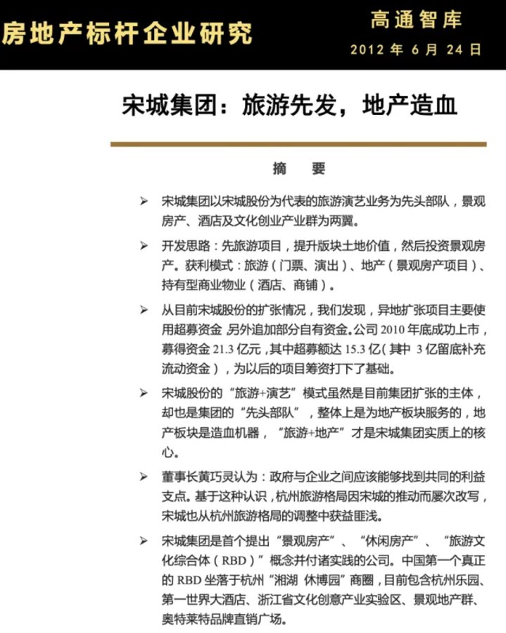 2012年6月,高通智库的一份研究报告将宋城集团的业务拆解为:“以宋城股份为代表的旅游演艺业务为先头部队,景观房产、酒店及文化创业产业群为两翼。”