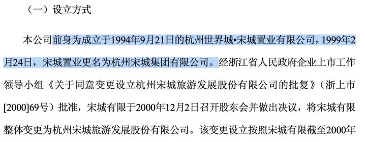 1999年2月, “杭州世界城·宋城置业有限公司”正式更名为“杭州宋城集团有限公司”,次年实施股改,宋城有限整体变更杭州宋城旅游发展股份有限公司,也就是后来上市的“宋城股份(2014年更名为宋城演艺)。