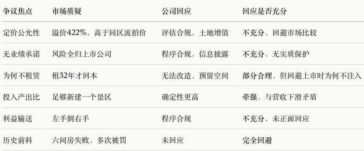 其三, 对于从机构调研到投资者互动中提出的主要疑问,包括:标的资产评估增值率高达422.74%,账面净资产1.84亿元,评估价9.63亿元;宋城实业2024年净利润仅203万元,按此计算回本周期超过400年; 同期杭州西湖区类似地块司法拍卖六四折仍流拍,宋城交易单价高出约56%; 为何不设业绩承诺等,公司回应几乎均停留在程序合规层面。