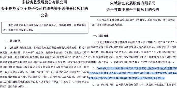 果然,约一年后,大明宫景区选定的地址还是黄了。2018年3月,宋城演艺宣布“因公司另行选址,原《“西安千古情景区”项目合作协议》终止”,同时与西安世园投资(集团)有限公司签订了《中华千古情项目合作协议》。
