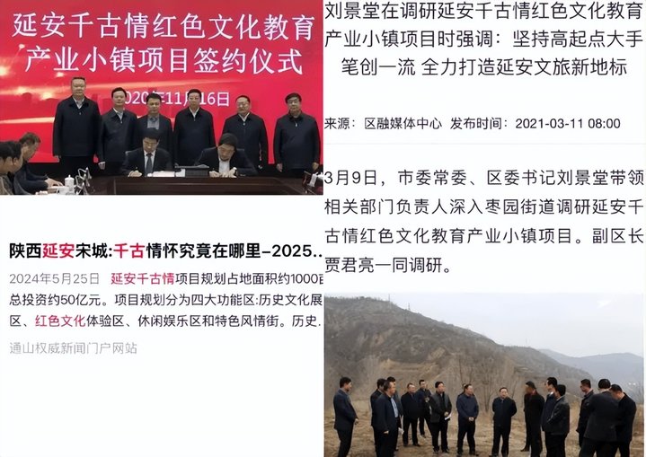 而据签约当日召开的座谈会,此次合作其实是一个特色小镇项目,名为“宋城延安千古情红色文化教育产业小镇”,此后一度流传“占地面积约1000亩,总投资约50亿,规划分为历史文化展示区、红色文化体验区、休闲娱乐区和特色风情街”等信息。