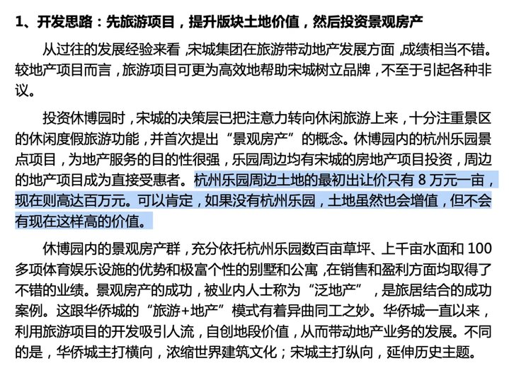 报告给出一个“主题公园→人流聚集→土地增值→地产开发”闭环下的一个例子是:“杭州乐园周边土地从最初(1998年)的8万元/亩涨至(2012年)百万元级别。
