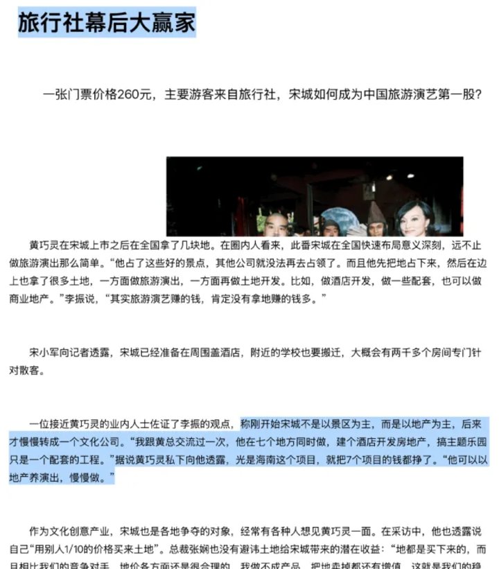 约十年前的一篇关于宋城演艺报道曾引述一位接近黄巧灵的业内人士,其坦言:“跟黄总交流过一次,他在七个地方同时做,建个酒店开发房地产,搞主题乐园只是一个配套的工程。”据说黄巧灵私下向他透露,光是海南这个项目,就把7个项目的钱都挣了。“他可以以地产养演出,慢慢做。”