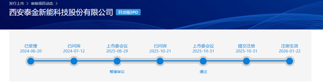 泰金新能上市申请于2024年6月20日获受理,保荐机构为中信建投证券。该公司经历两轮审核问询回复后,曾于2025年8月29日首次上会,但彼时审议结果为暂缓审议。此后泰金新能进行了上市委会议意见落实函的回复,于10月31日过会并提交注册,1月22日注册生效。