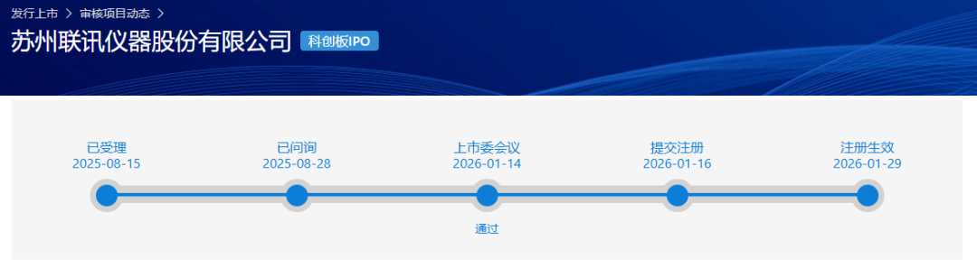 上交所官网显示,联讯仪器的科创板IPO申请于1月29日注册生效,该公司IPO申请于2025年8月15日获受理,经历两轮审核问询后,最终得以过会,是2026年科创板首家过会企业。