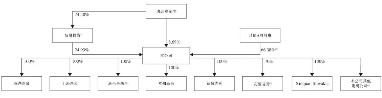 IPO前,新泉股份由新泉投资(该公司由唐志华拥有及控制)直接持股24.93%,及由唐志华直接持股8.69%。因此,截至最后实际可行日期,唐志华及新泉投资为新泉股份的一组控股股东。