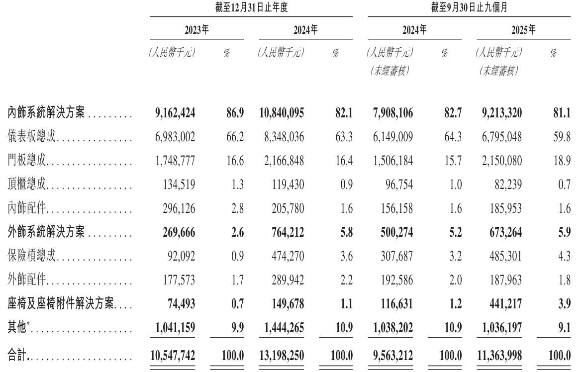 新泉股份2025年前9个月来自内饰系统解决方案收入为92.13亿元,占营收的比例为81.1%;来自外饰系统解决方案收入为6.73亿元,占比为5.9%;来自座椅及座椅附件解决方案收入为4.41亿元,占比为3.9%。