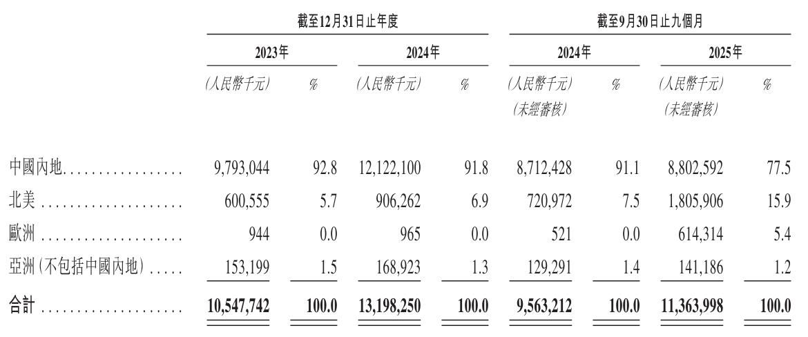 从收入来源看,新泉股份2025年前9个月来自中国内地的收入为88亿元,占比为77.5%;来自北美的收入为18亿元,占比为15.9%;来自欧洲的收入为6.14亿元,占比为5.4%。