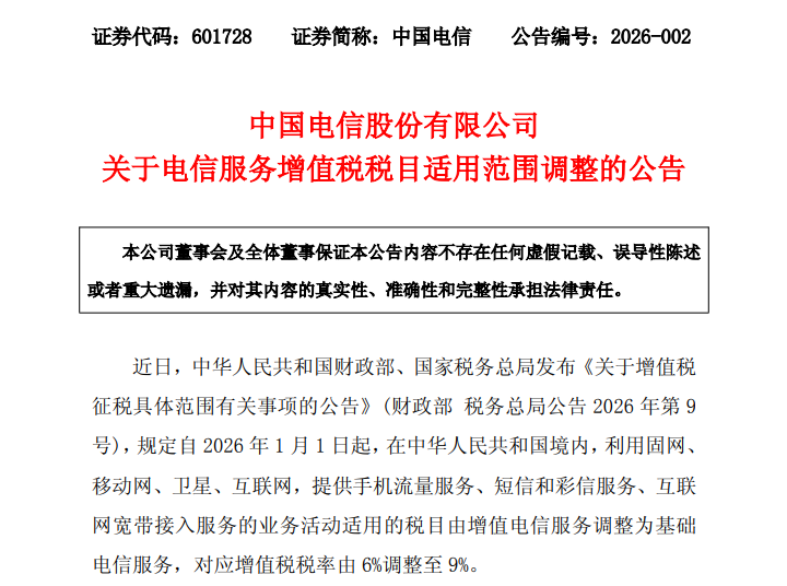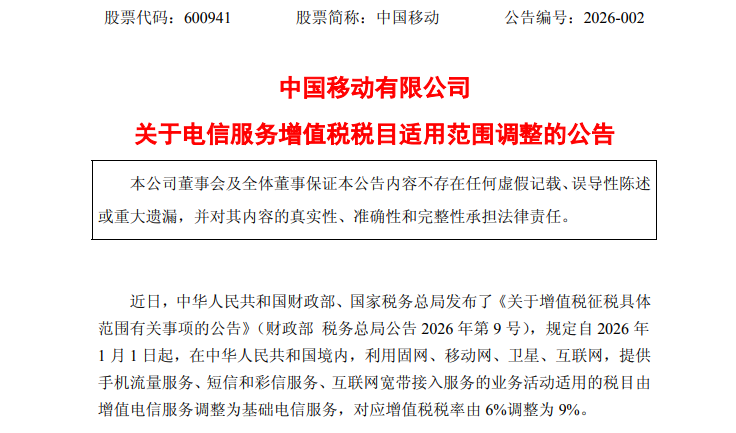 2月1日,中国移动、中国电信、中国联通发布公告称,近日,中华人民共和国财政部、国家税务总局发布了《关于增值税征税具体范围有关事项的公告》(财政部税务总局公告2026年第9号),规定自2026年1月1日起,在中华人民共和国境内,利用固网、移动网、卫星、互联网,提供手机流量服务、短信和彩信服务、互联网宽带接入服务的业务活动适用的税目由增值电信服务调整为基础电信服务,对应增值税税率由6%调整为9%。