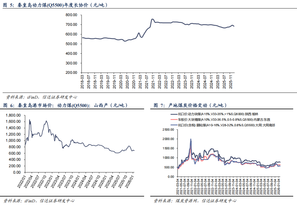 ●长协煤价格:1月,秦皇岛港动力煤(Q5500)年度长协价为684元/吨,月环比下跌10元/吨。