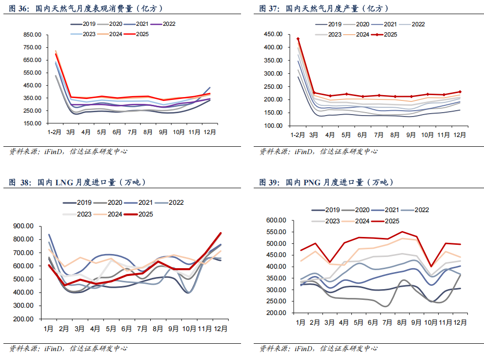 2025年1-12月,国内天然气产量累计为2618.90亿方,累计同比上升6.3%。2025年1-12月,LNG进口量累计为6843.00万吨,累计同比下降10.7%。2025年1-12月,PNG进口量累计为5943.00万吨,累计同比上升8.0%。