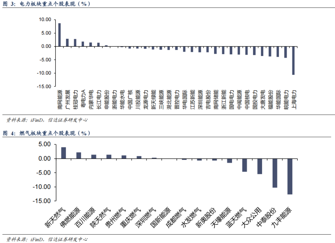截至1月30日收盘,本周电力板块主要公司涨跌幅前三名分别为:南网能源(8.74%)、广州发展(2.87%)、桂冠电力(2.83%),主要公司涨跌幅后三名分别为:上海电力(-10.63%)、皖能电力(-4.25%)、华能国际(-3.95%);本周燃气板块主要公司涨跌幅前三名分别为:新天然气(4.04%)、佛燃能源(2.22%)、百川能源(1.40%),主要公司涨跌幅后三名分别为:九丰能源(-12.66%)、中泰股份(-10.31%)、大众公用(-5.46%)。