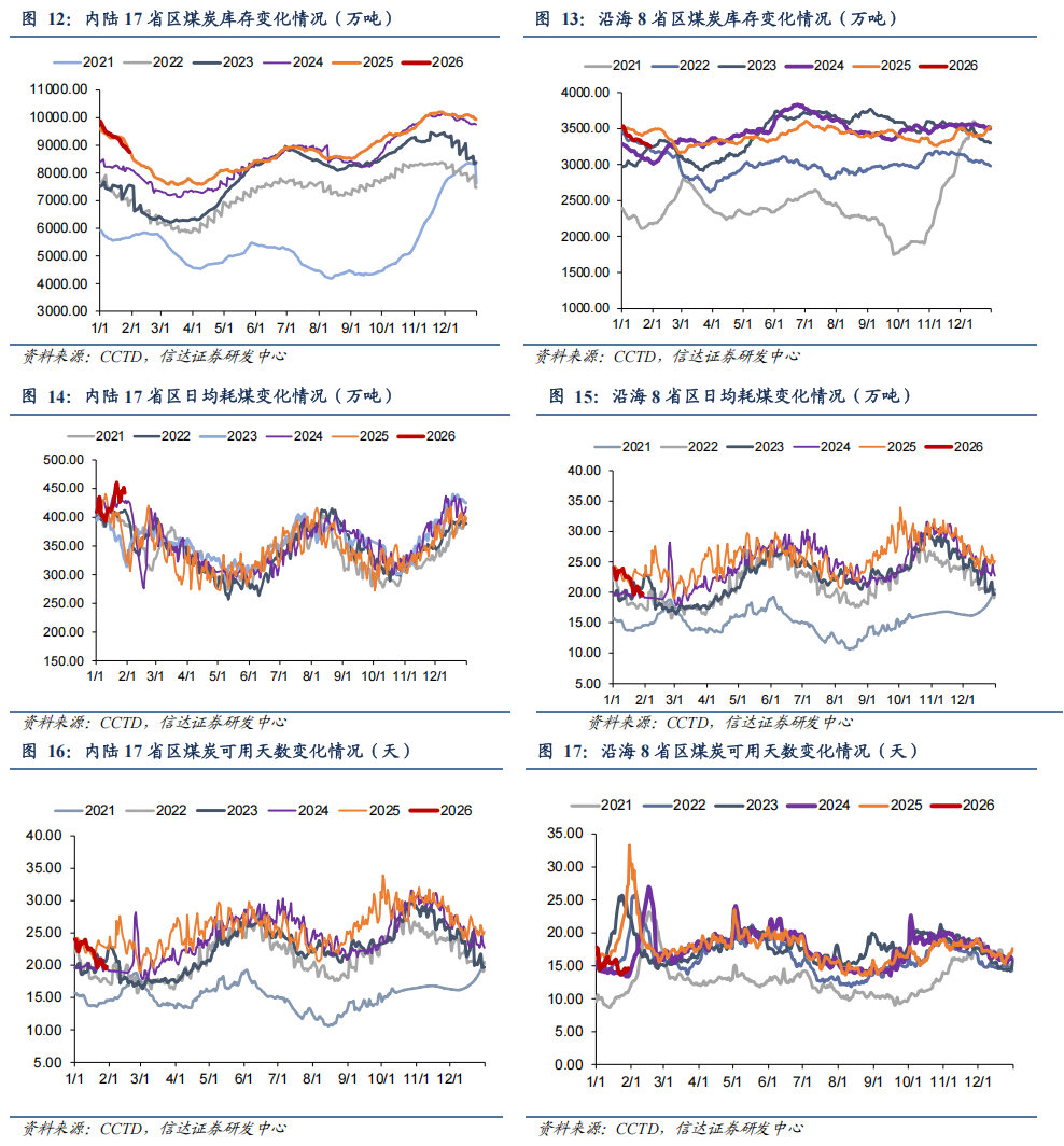 ● 内陆17省电厂库存、日耗及可用天数:截至1月29日,内陆17省煤炭库存8758.8万吨,较上周下降251.6万吨,周环比下降2.79%;内陆17省电厂日耗为442.3万吨,较上周下降3.6万吨/日,周环比下降0.81%;可用天数为19.8天,较上周下降0.4天。