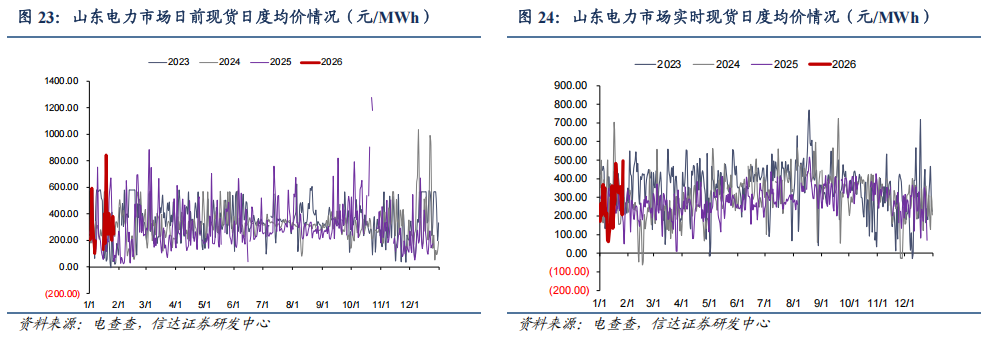 ● 山东日前现货市场:截至1月25日,山东电力日前现货市场的周度均价为334.33元/MWh,周环比上升50.70%,周同比上升14.9%。