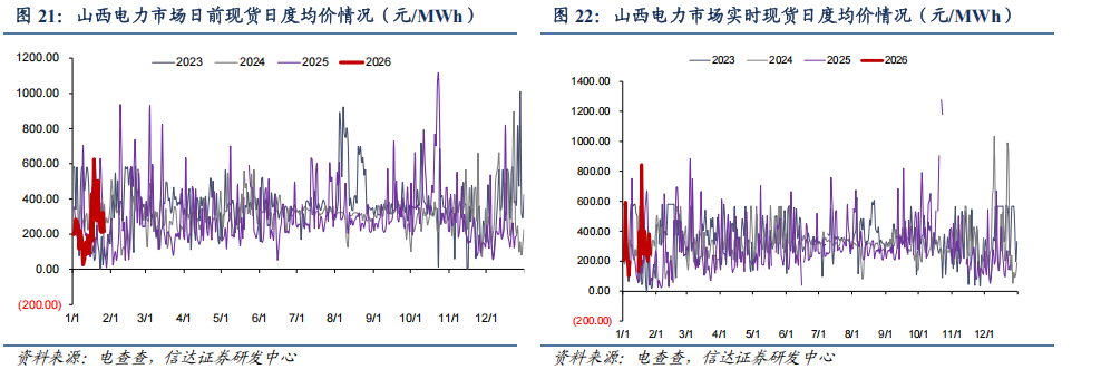 ● 山西日前现货市场:截至1月26日,山西电力日前现货市场的周度均价为294.73元/MWh,周环比上升4.39%,周同比下降20.8%。