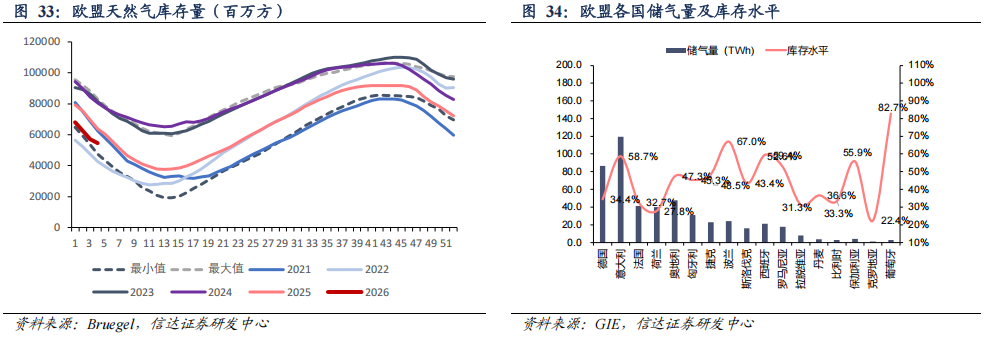 欧盟天然气供需及库存:2026年第3周,欧盟天然气供应量63.4亿方,同比上升14.8%,周环比上升4.6%。其中,LNG供应量为32.1亿方,周环比上升12.6%,占天然气供应量的50.6%;进口管道气31.3亿方,同比上升4.2%,周环比下降2.6%。2026年第3周,欧盟天然气消费量(我们估算)为118.2亿方,周环比上升0.8%,同比上升6.2%;2026年1-3周,欧盟天然气累计消费量(我们估算)为334.9亿方,同比上升13.4%。
