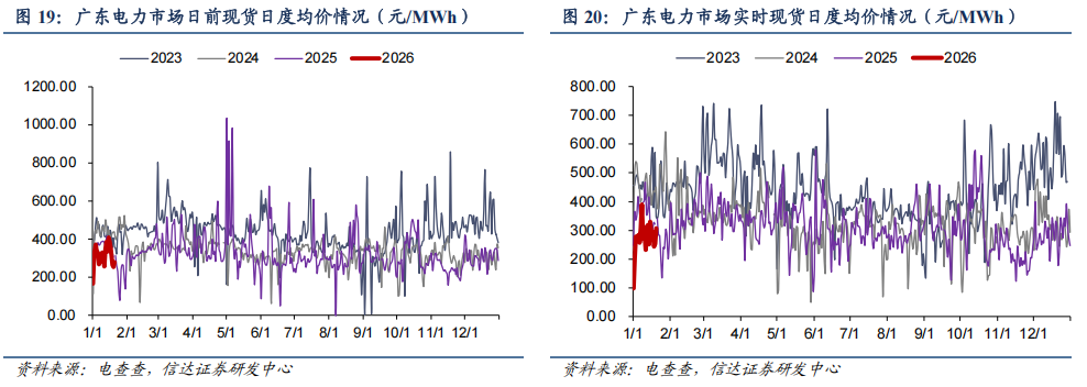 ● 广东实时现货市场:截至1月20日,广东电力实时现货市场的周度均价为281.51元/MWh,周环比下降7.78%,周同比下降15.0%。