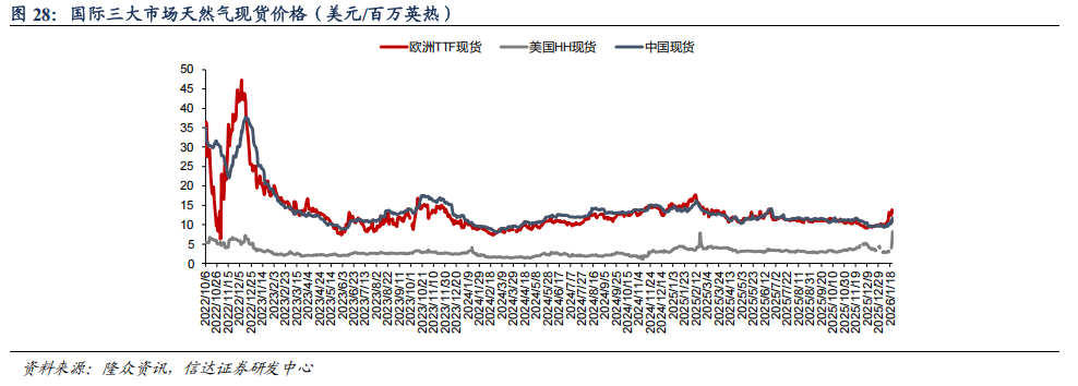 截至1月29日,欧洲TTF现货价格为14.12美元/百万英热,同比下降9.8%,周环比上升7.0%;美国HH现货价格为9.72美元/百万英热,同比上升174.6%,周环比上升19.4%;中国DES现货价格为11.91美元/百万英热,同比下降13.4%,周环比上升2.6%。