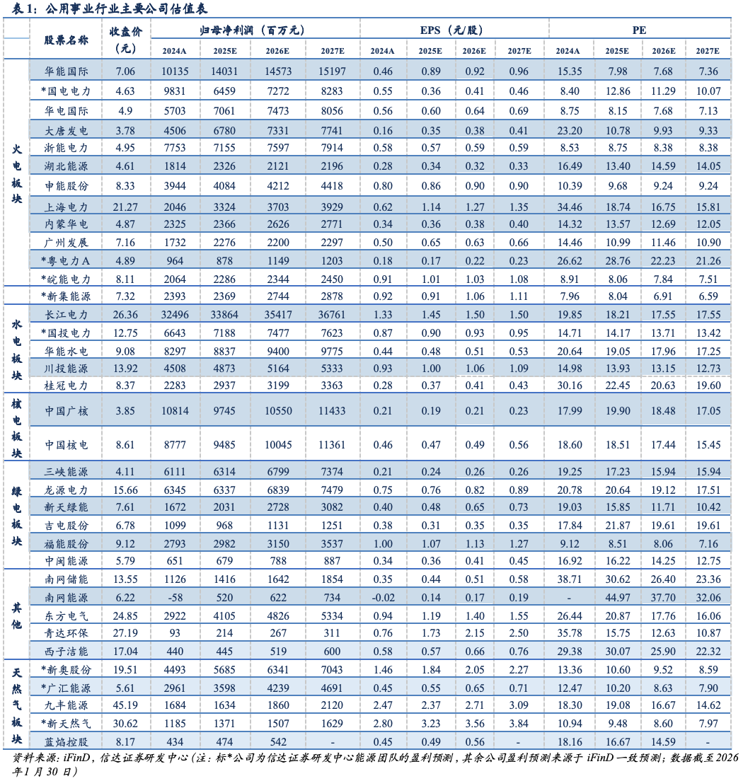 本周行业重点新闻:1)国家推出容量电价机制改革,助力构建新型电力系统、促进能源绿色低碳转型。近日,国家发展改革委、国家能源局为贯彻落实国家关于能源领域价格改革及新型能源体系建设的决策部署,联合印发《关于完善发电侧容量电价机制的通知》,旨在通过分类完善煤电、气电、抽水蓄能和新型储能等调节性电源的容量电价机制,引导其平稳有序建设,保障电力系统安全稳定运行,助力能源绿色低碳转型。《通知》明确将结合实际提高煤电容量电价标准,研究建立气电容量电价机制;对新建抽水蓄能电站按弥补平均成本原则制定统一容量电价;并建立电网侧独立新型储能容量电价机制,依据放电时长与顶峰贡献等因素确定标准。2)2025年,全国天然气表观消费量4265.5亿立方米,同比增长0.1%。1月27日,国家发展改革委发布2025年12月份全国天然气运行快报。据快报统计,2025年12月,全国天然气表观消费量385.7亿立方米,同比增长1.9%。2025年,全国天然气表观消费量4265.5亿立方米,同比增长0.1%。