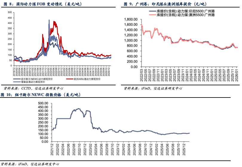 截至1月29日,纽卡斯尔NEWC5500大卡动力煤FOB现货价格74.5美元/吨,周环比上涨0.95美元/吨;ARA6000大卡动力煤现货价99.05美元/吨,周环比下跌2.45美元/吨;理查兹港动力煤FOB现货价81.5美元/吨,周环比上涨1.50美元/吨。截至1月30日,纽卡斯尔NEWC指数价格110.1美元/吨,周环比上涨1.7美元/吨。截至1月30日,广州港印尼煤(Q5500)库提价743.22元/吨,周环比上涨11.32元/吨;广州港澳洲煤(Q5500)库提价747.97元/吨,周环比上涨10.82元/吨。