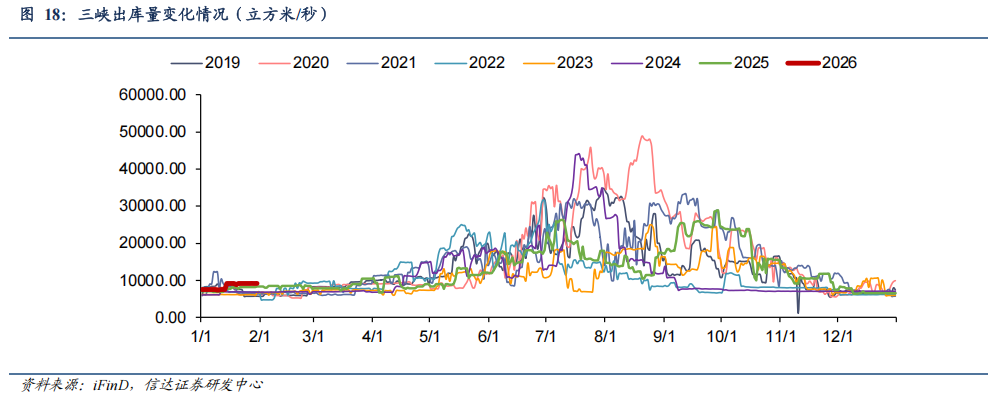 水电来水情况:三峡出库流量周环比增加。截至1月30日,三峡出库流量9230立方米/秒,同比上升12.01%,周环比上升0.54%。