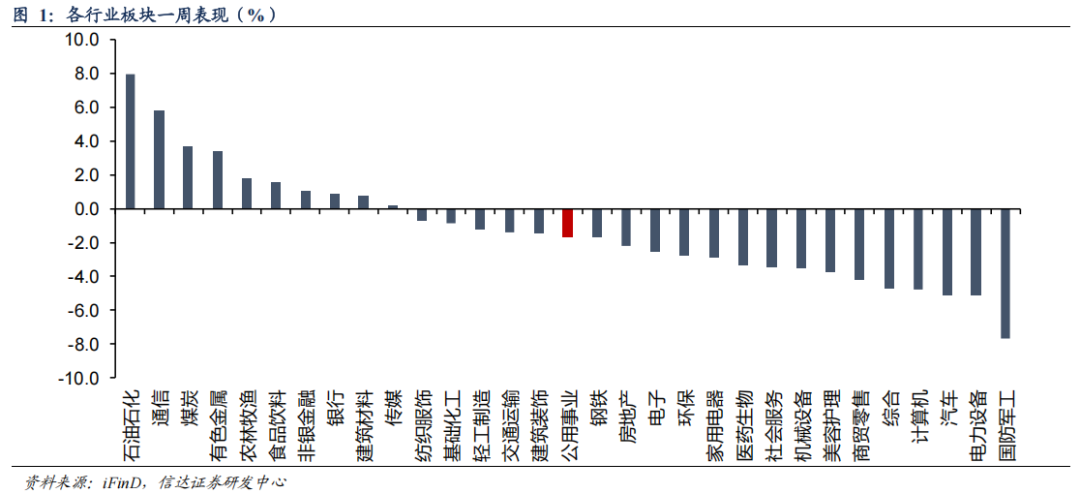 截至1月30日收盘,本周公用事业板块下跌1.7%,表现劣于大盘;沪深300上涨0.1%到4706.34;涨跌幅前三的行业分别是石油石化(8.0%)、通信(5.8%)、煤炭(3.7%),涨跌幅后三的行业分别是国防军工(-7.7%)、电力设备(-5.1%)、汽车(-5.1%)。
