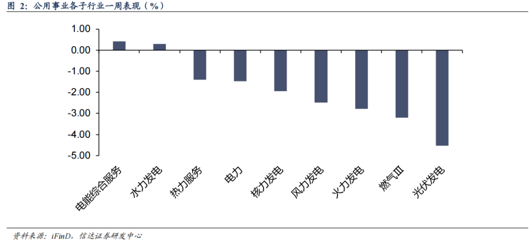 截至1月30日收盘,本周公用事业板块下跌1.7%,表现劣于大盘。其中,电力板块下跌1.48%,燃气板块下跌3.20%。